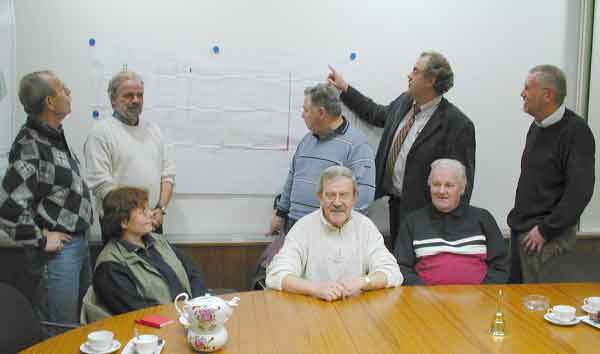 Foto: Die Mitglieder der Fraktion aus SPD und GRÜNEN Roland Seemann, Barbara Gruner, Hartmut Bugiel, Bernhard Bloem, Wilhelm Kröger (von links nach rechts), Anton Schippmann (2. von rechts), Gottfried Sandmann (rechts) lassen sich von Norbert Averdung (3. von rechts) die Pläne für den Umbau des Hallenbades erläutern.