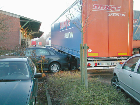 Auf dem Parkplatz der Firma Bunte sind noch genügend Abstellmöglichkeiten vorhanden. Aber der Anhänger wurde so platziert, dass kein Zentimeter Rangiermöglichkeit vorhanden ist.