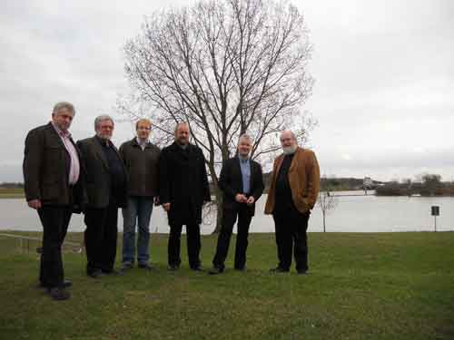 SPD-Europaabgeordneter Matthias Groote (2. von rechts) im Gespräch mit SPD-Ratsherr Bernd Schmees (links), SPD-Ratsherr Günter Klein (2. von links), SPD-Ortsvereinsvorsitzender Peter Behrens ( 3. von links), SPD-Ratsherr Jürgen Broer (Mitte) und SPD-Fraktionsvorsitzender Peter Raske über die Zukunft der Ems.